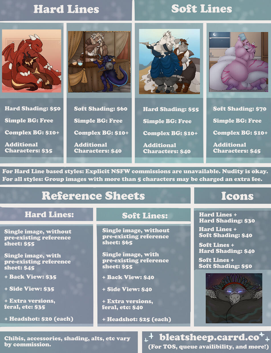 Hey there! Here’s a spot for me to lay down some baseline rules, for both of us, and tell you a little bit about the process of my art.Rules:1. Do not edit my art. If you’ve bought an adoptable, or any other form of commission from me and would like changes, just let me know! I’d be happy to make them, within reason.2. Do not watermark my art as your own. Generic watermarks, ie, the ones that say “toyhou.se”, or “Deviantart”, are okay. Please do not watermark the pieces I make for you with one that says “yournameart”, or “artbyyourname”.General policies:1. You must be 18+ to commission or purchase NSFW.2. You can upload the art I make for you wherever you like! Just please do give credit.3. I will generally be uploading the commissions I complete for you to my FurAffinity gallery and/or Bluesky page, unless you request otherwise. I have quite the backlog of completed commissions, so if you'd like something uploaded sooner rather than later, feel free to make a request.4. You cannot sell my art as stickers/totebags/etc unless otherwise pre-arranged.5. I am willing to work with you if payment needs to be delayed for some reason or another, but please communicate with me, and let me know that there is a problem.6. I handle will draw/won’t draws on a case-by-case basis. The exceptions are a pretty short list: I will not draw diapers, extreme guro, NSFW cub, or humans.Queue Policies1. You may only take one slot per queue at a time (For example, one blind bag and one flat price at the same time would be fine).2. I allow 2 commissions per slot.3. YCH slots do not follow the above rules.Adopt policies:1. You can make changes to their designs! Just please do it in your own art, and do not edit the ref sheets or images that I make for you.Art Process - Queue:1. My queue has two sections: The public "Queue" section, and the private "Waitlist" section. Commissioners on the Waitlist are slotted into the Queue as slots become available.2. Once the Waitlist is empty, I open up my Commission Form. The best way to get notified when it opens is by grabbing a "Flat Price" or "Blind Bag" role on my Discord server. I will keep the form open for 1 week, at which point I'll close it and choose my preferred commissions, adding them to the Waitlist.3. If you aren't selected for that round of commissions, it's nothing personal, I promise- please feel free to apply again when your preferred queue opens next!Art Process - Drawing:1. For standard commissions, there are generally four watermarked WIPs: Sketch, lines, color, and completion. You can request changes, within reason, at any of these stages.2. Once the art is completed and you've approved it, I'll send you my payment information. Once the payment comes through and I'm able to confirm that it has, I'll send the unwatermarked copy your way- and I'm more than happy to provide copies via email as well, for the highest possible resolution.